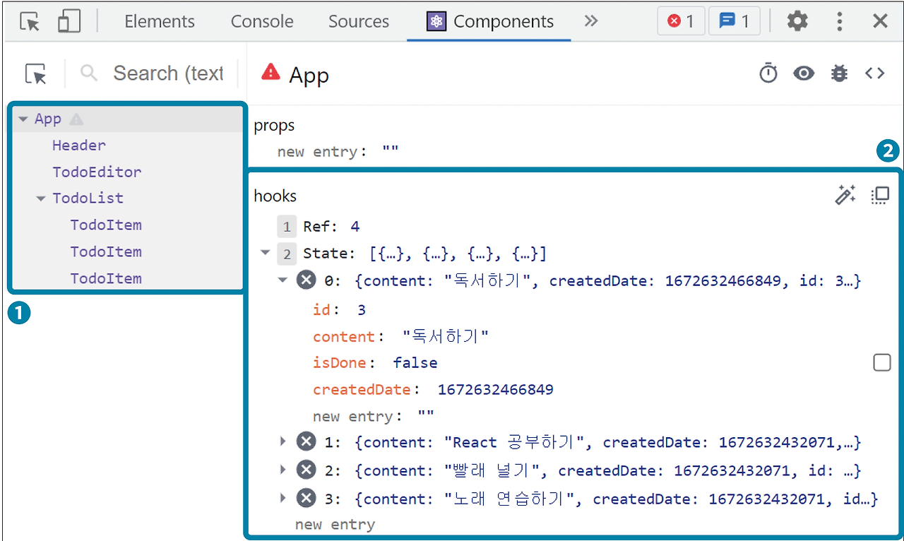 아직 App 컴포넌트의 todo 값을 페이지에 렌더링하는 Read 기능은 개발하지 않았기 때문에 개발자 도구의 [Components] 탭에서 직접 확인해야 한다.