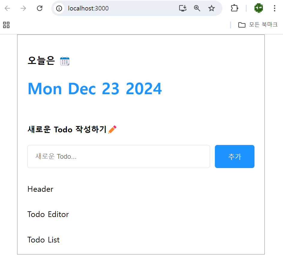 마지막으로 렌더링 결과를 확인하면 UI 구현을 완료한 것을 알 수 있다. 이제 App 컴포넌트에서 경계를 확인할 필요가 없으니, App.css의 border 속성은 제거 또는 주석 처리한다.