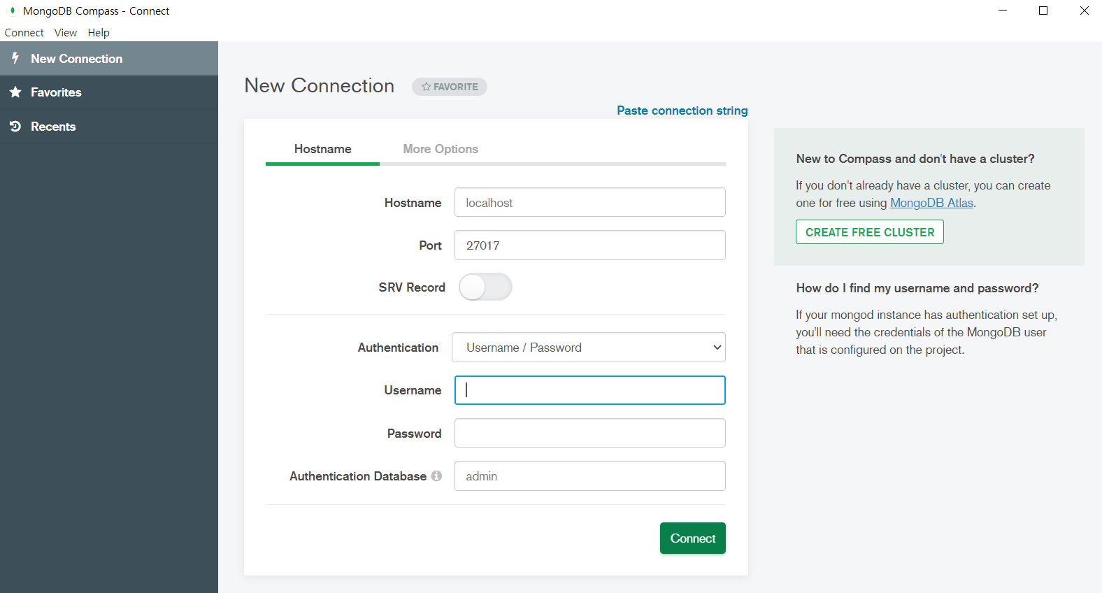 3. Authentication을 User/Password로 바꾸고 몽고디비 계정 이름과 비밀번호 입력, CONNECT 버튼을 눌러 localhost:27017에 접속(admin, config, local 데이터베이스)