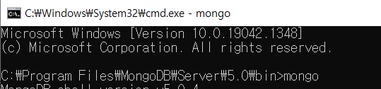 4. 몽고디비 프롬프트(>) 접속: C:\Program Files\MongoDB\Server\5.0\bin 콘솔(2)에서 mongo 명령어 입력