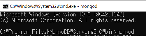 3. 몽고디비 실행: C:\Program Files\MongoDB\Server\5.0\bin 콘솔(1)에서 mongod명령어 입력