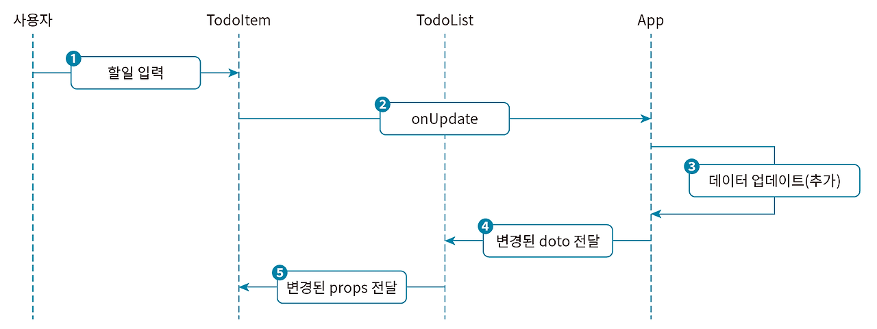 리액트 컴포넌트는 바로 한 단계 아래의 자식 컴포넌트에만 데이터를 전달할 수 있으므로 한 단계 이상 떨어져 있는 자식 컴포넌트로 데이터를 전달하려면 전달을 반복해야 한다. 따라서 TodoList의 자식은 해당 함수를 사용하지 않더라도 TodoItem 컴포넌트에 함수 onUpdate를 전달해야 하므로, Props로 받아 다시 전달하는 매개 역할을 수행한다.