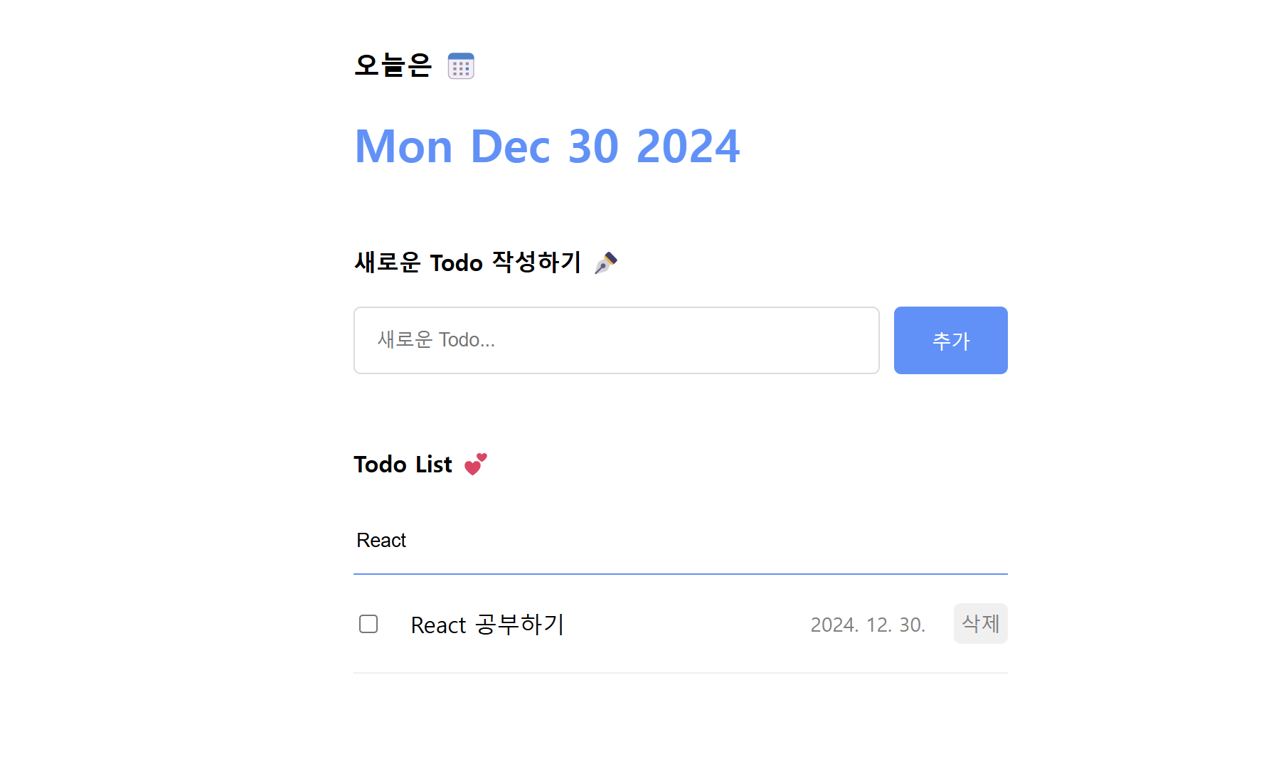 여기까지 할 일 관리 앱을 모두 완성하였다. 그러나 앞에서 잠깐 언급하였던 Props Drilling, 최적화 문제, 분리되지 않은 상태 관리 등 리액트 서비스와 관련해 알아야 할 내용들이 더 있다. 이 개념들은 다음 과정에서 더 자세히 다룰 것이다.