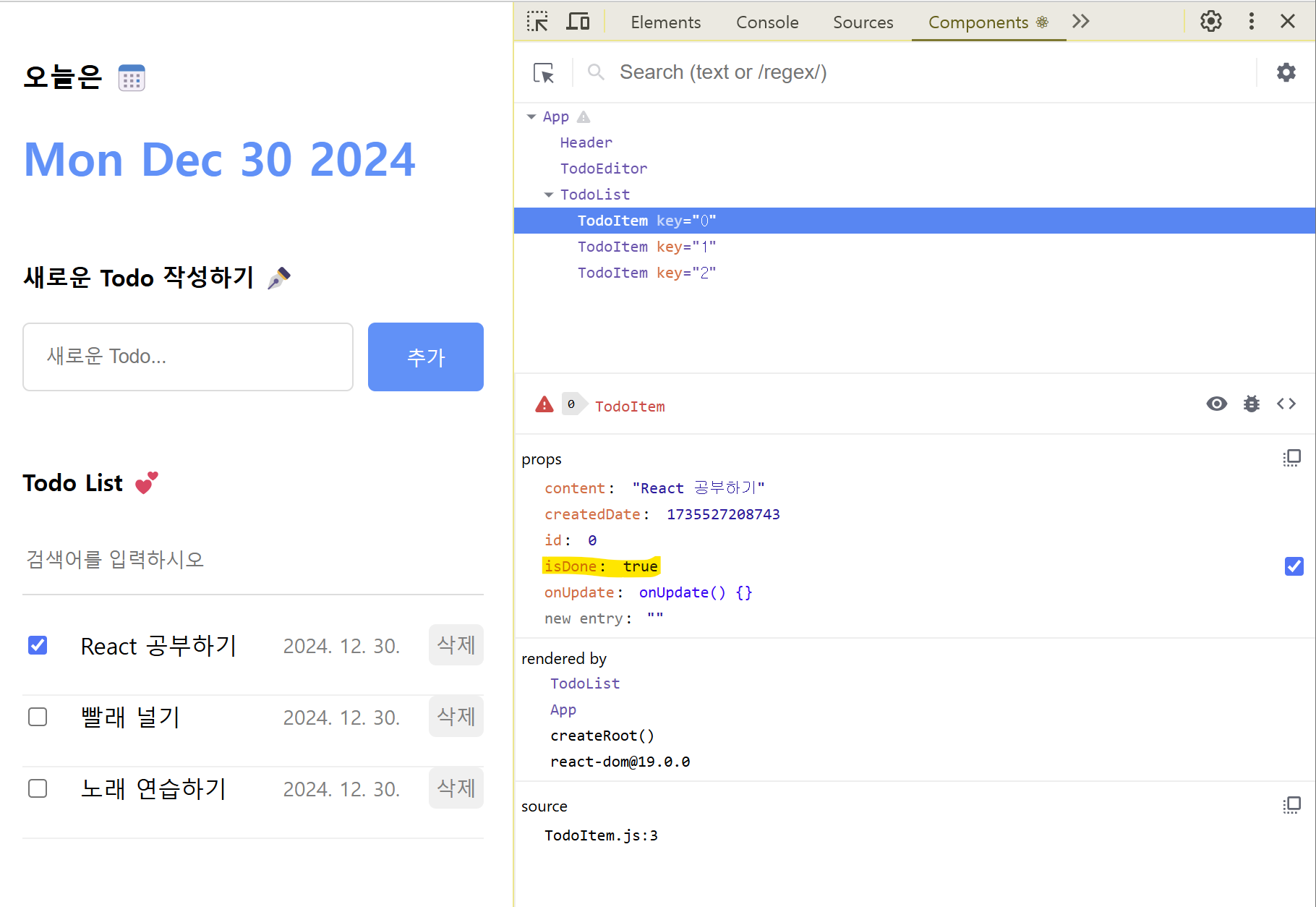 위와 같이 'React 공부하기'를 틱했을 때 Components 탭을 열어보면 TodoItem 컴포넌트에서 이 아이템의 isDone 프로퍼티가 true로 변경된 것을 확일할 수 있다.