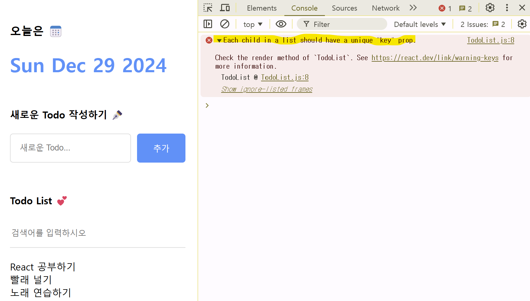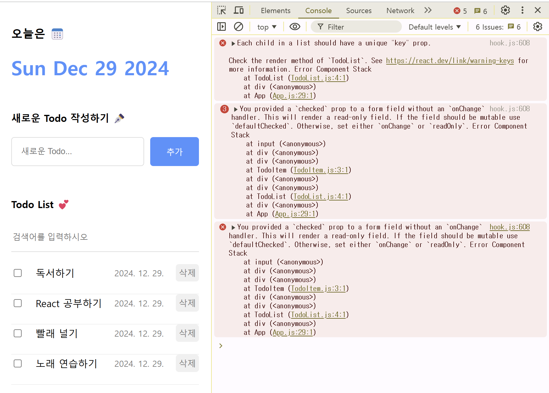 다음은 할 일 입력 폼에 '독서하기'라는 새 아이템을 추가한 결과이다. 그런데 개발자 도구 콘솔을 보면 앞서 확인했던 것과 같은 경고메시지가 출력되는 것을 볼 수 있다.