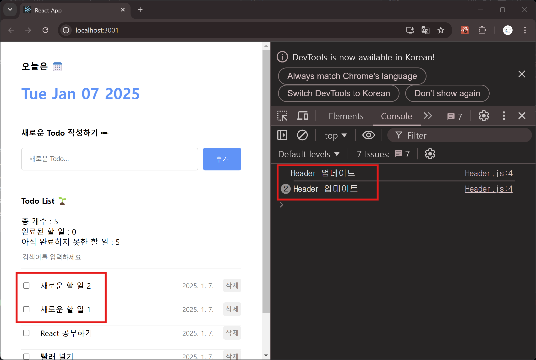 [ 할 일 관리 ] 앱의 Header 컴포넌트는 부모 컴포넌트인 App에서 아무런 Props도 받지 않고 단지 오늘 날짜를 표시하는 아주 단순한 기능만 하기 때문에 이 컴포넌트는 어떠한 경우에서도 리렌더할 필요가 없다. 문제점을 확인해보기 위해 콘솔창을 이용해 리렌더가 발생하는 지 확인해 본다.