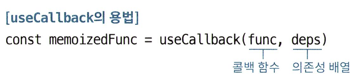 useCallback은 useMemo처럼 2개의 인수를 제공한다. 첫 번째 인수로는 메모이제이션하려는 콜백 함수를 전달하고, 두 번째 인수로는 의존성 배열을 전달하고 그 결과로 useCallback은 메모이제이션된 함수를 반환한다.
