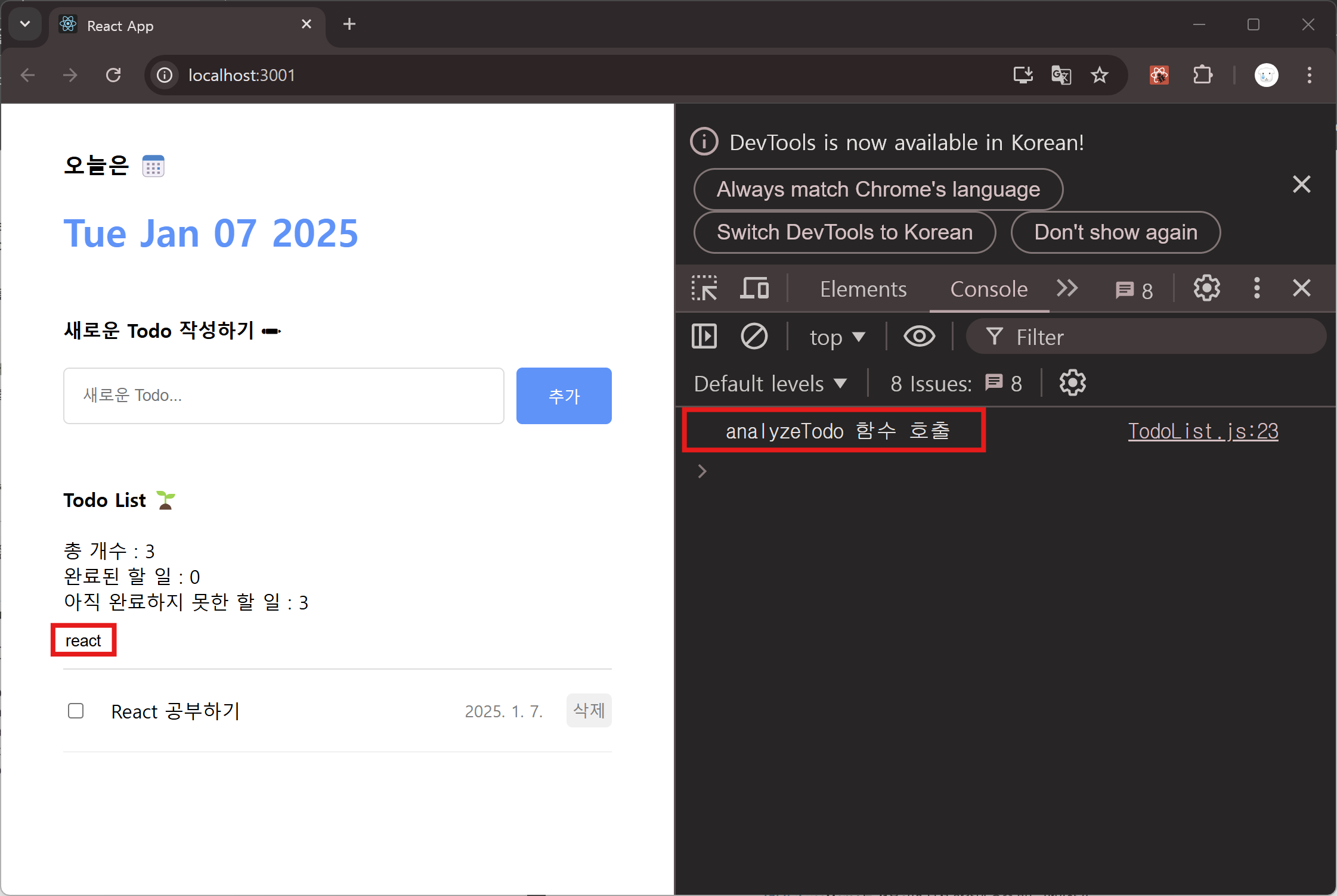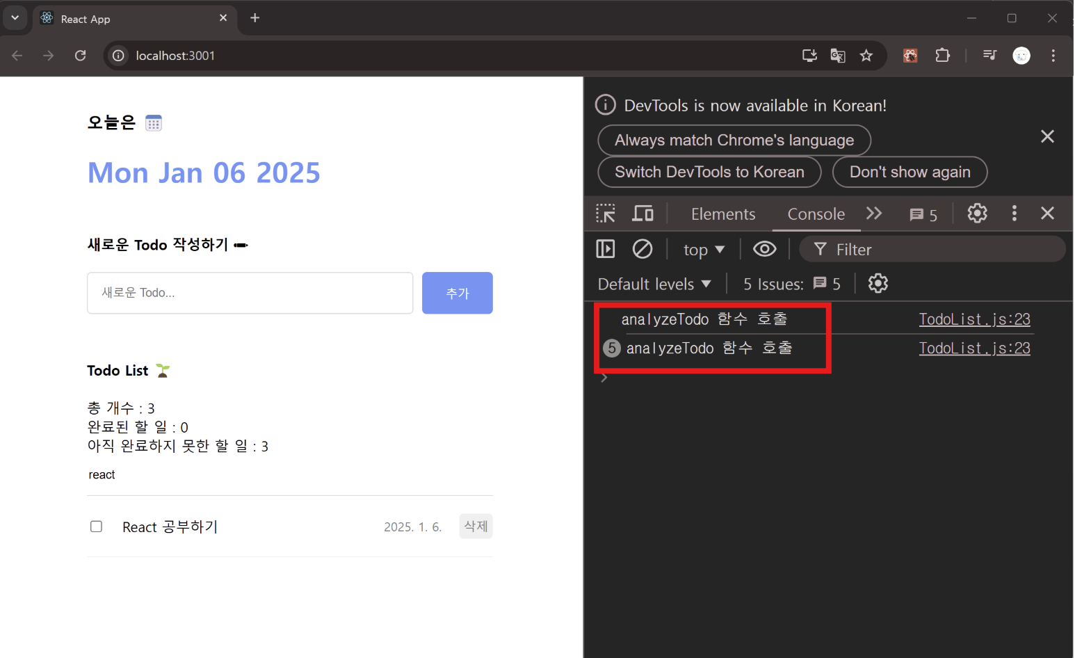 새 할 일 아이템을 추가해도 마운트 시점에만 한 번 콘솔에 메시지를 출력하는 것을 통해 최적화가 되었음을 알 수 있다.