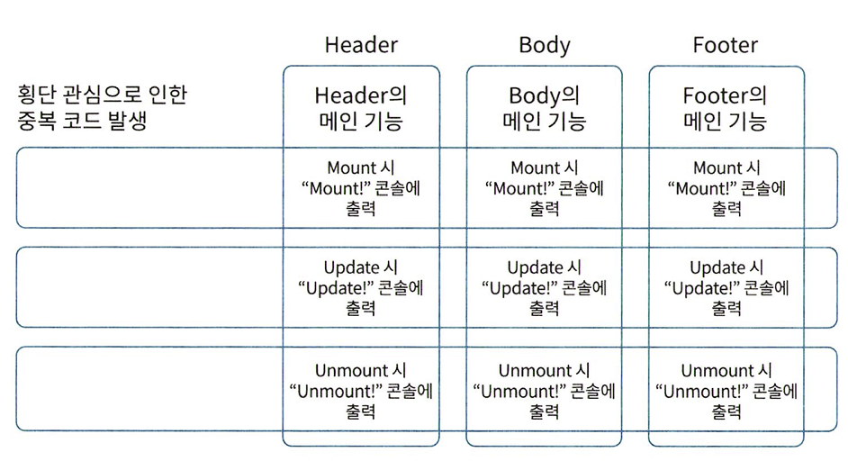 모든 컴포넌트가 마운트와 동시에 콘솔에 특정 메시지를 출력하는 기능은 컴포넌트의 핵심 로직은 아니다. 여러 컴포넌트에서 횡단 관심사 코드를 작성하는 일은 중복 코드를 만드는 주요 요인 중 하나다. ❗ 이때 고차 컴포넌트를 사용하면 횡단 관심사 코드를 분리할 수 있다.