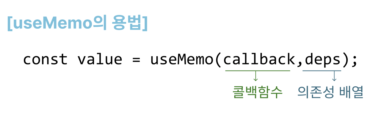 함수 useMemo를 호출하고 2개의 인수로 콜백 함수와 의존성 배열(deps)을 전달한다. 호출된 useMemo는 의존성 배열에 담긴 값이 바뀌면 콜백 함수를 다시 실행하고 결괏값을 반환한다.