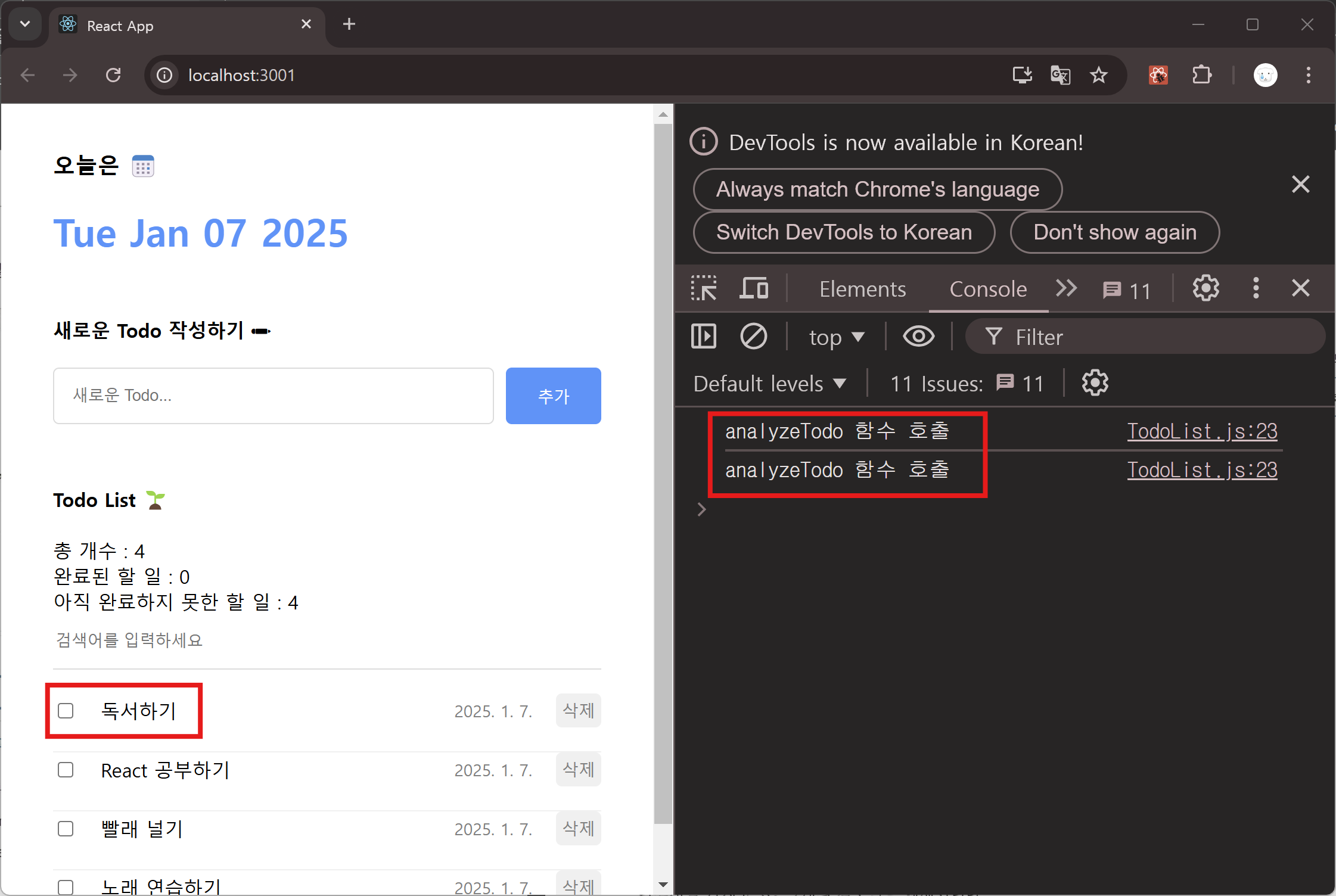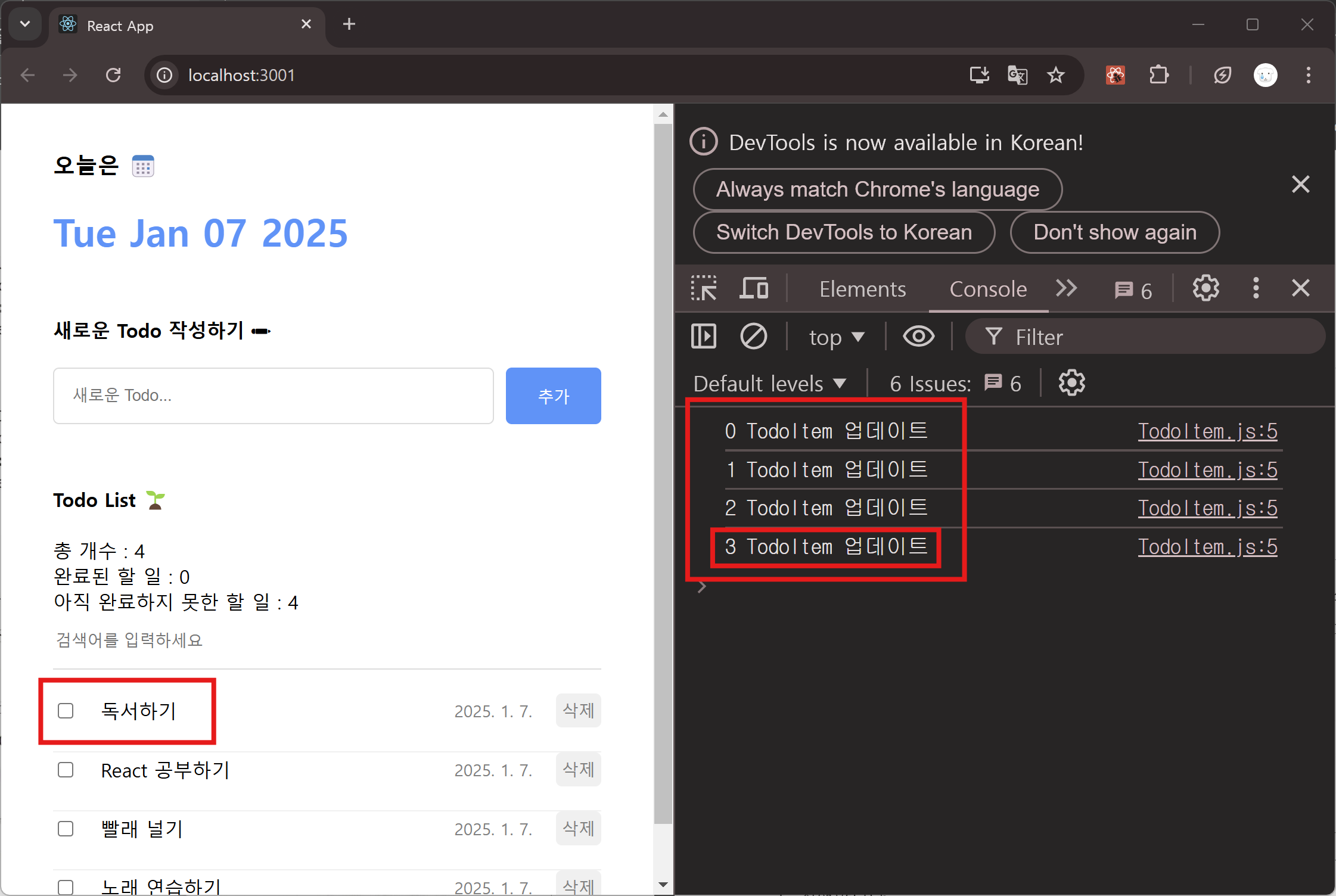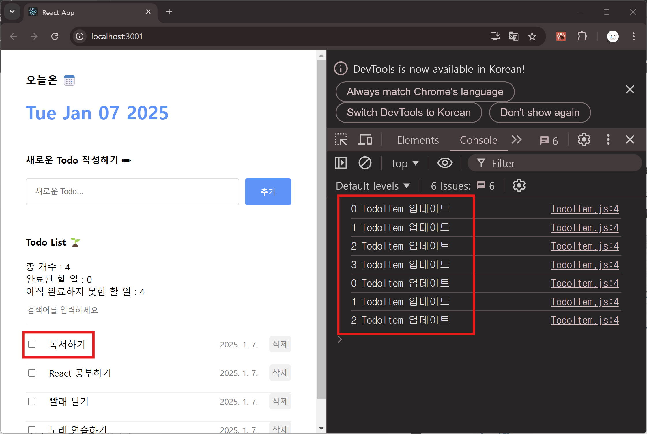 마찬가지로 어떤 상황에서 불필요한 렌더링이 일어나는지 알아보기 위해 Todoltem을 렌더링할 때마다 해당 아이템의 id를 포함하는 문자열을 콘솔에 출력해 본다. 새 할 일 아이템으로 독서하기 를 추가한 뒤 콘솔창을 확인한다.