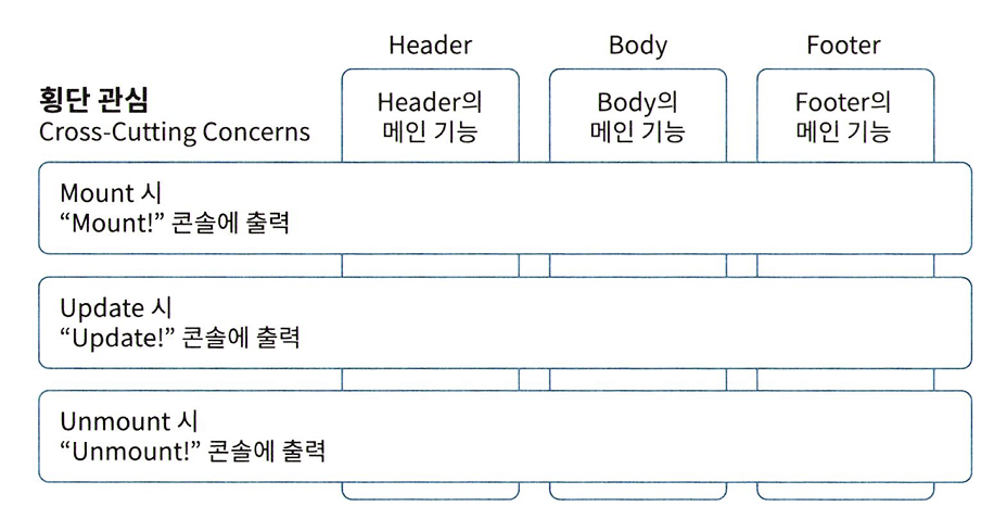 컴포넌트의 핵심 기능(비즈니스 로직)을 세로로 배치한다고 했을 때, 여러 컴포넌트 에서 공통으로 사용하는 기능은 가 로로 배치하게 되어 공통 기능들이 핵심 컴포넌트들을 마치 ‘횡단’하는 모습이다.