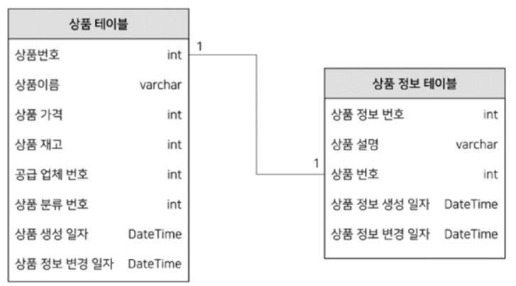 하나의 상품(Product)에 하나의 상품정보(ProductDetail)가 매핑되는 구조로 일대일 관계를 구현합니다. 이를 위해 엔터티와 매핑 테이블을 설계합니다.