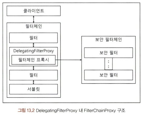 필터체인은 서블릿 컨테이너에서 관리하는 ApplicationFilterChain을 의미합니다. 클라이언트에서 애플리케이션으로 요청을 보내면 서블릿 컨테이너는 URI를 확인해서 필터와 서블릿을 매핑합니다. 스프링 시큐리티는 사용하고자 하는 필터체인을 서블릿 컨테이너의 필터 사이에서 동작시키기 위해 아래 그림과 같이 DelegatingFilterProxy를 사용합니다.