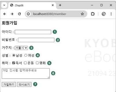 // 나머지 모든 폼 파라미터(id, passwd, city, sex, greetings 등)는 바인딩이 허용됩니다.