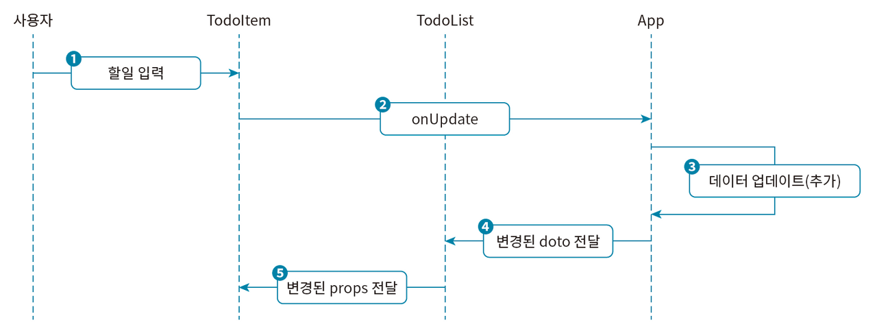 따라서 TodoList 자신은 해당 함수를 사용하지 않지만, TodoItem 컴포넌트에 함수 onUpdate를 전달해야하므로 Props로 받아 다시 전달하는 일종의 매개 역할을 수행한다.