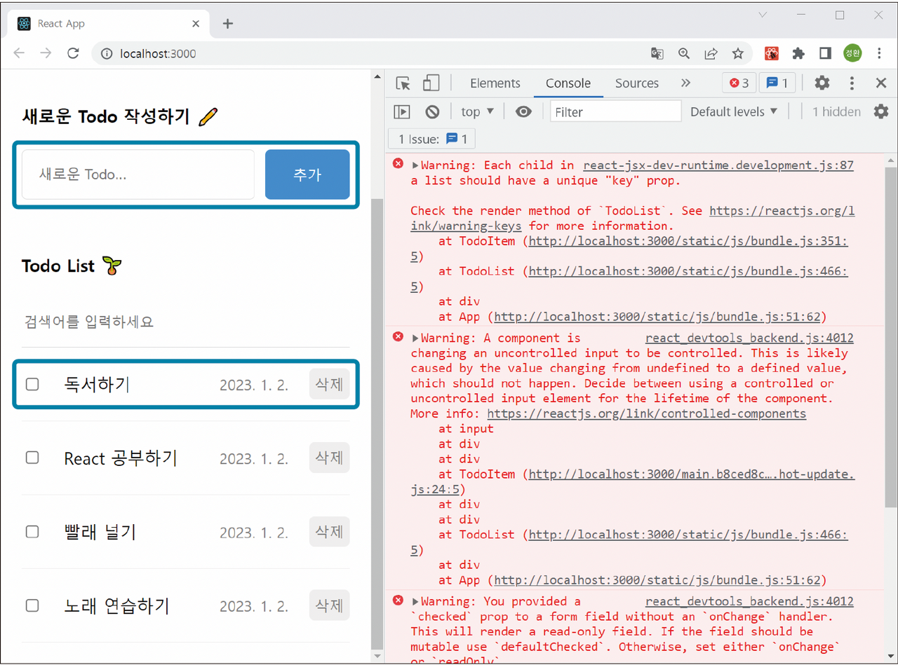 저장한 다음, 할 일 입력 폼에 '독서하기'라는 새 아이템을 추가해 결과를 확인한다.