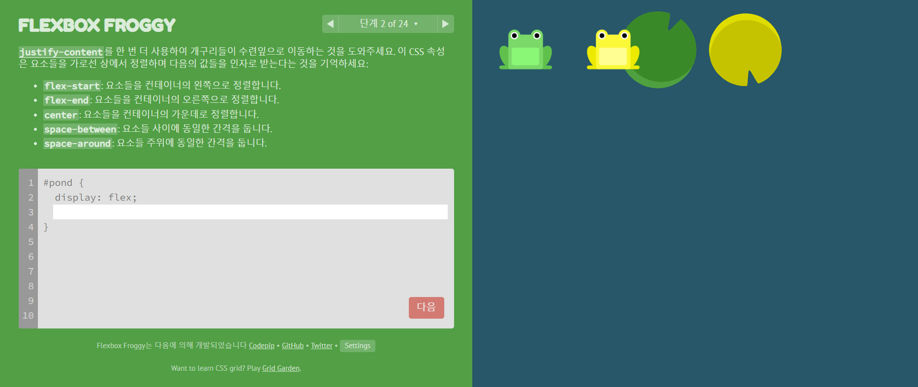 ▶ Flexbox Froggy: https://flexboxfroggy.com/#ko
