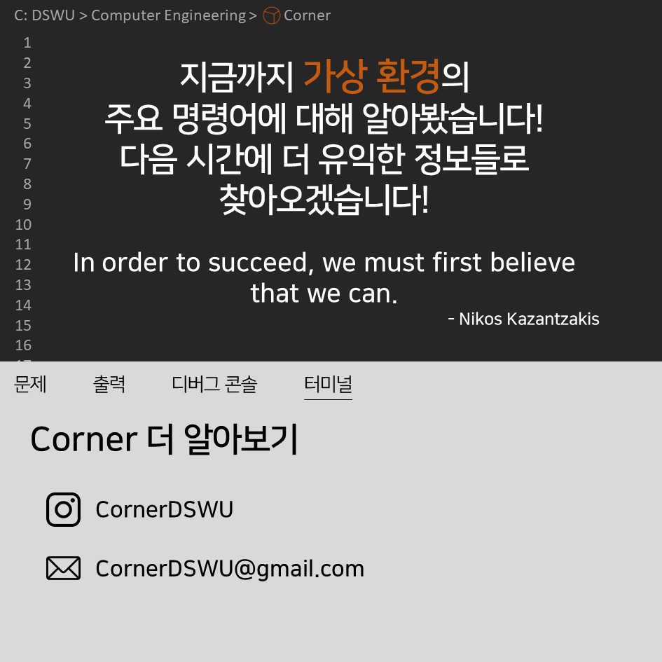 안녕하세요, 컴퓨터공학전공 개발 소모임 𝘾𝙤𝙧𝙣𝙚𝙧입니다.