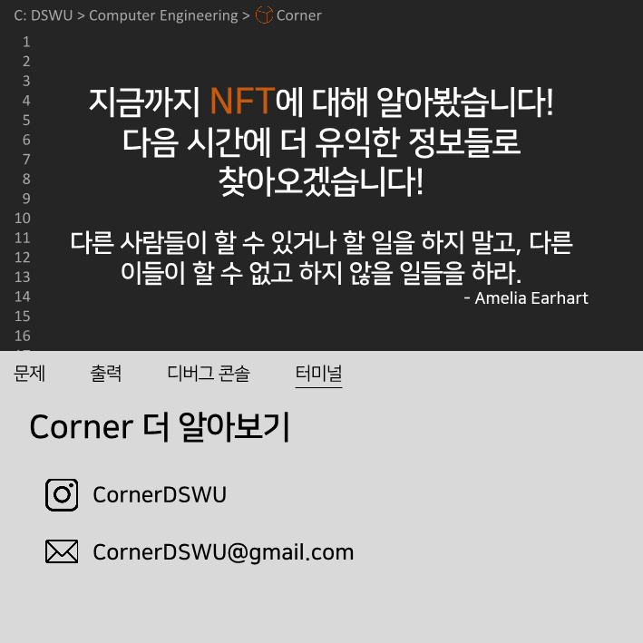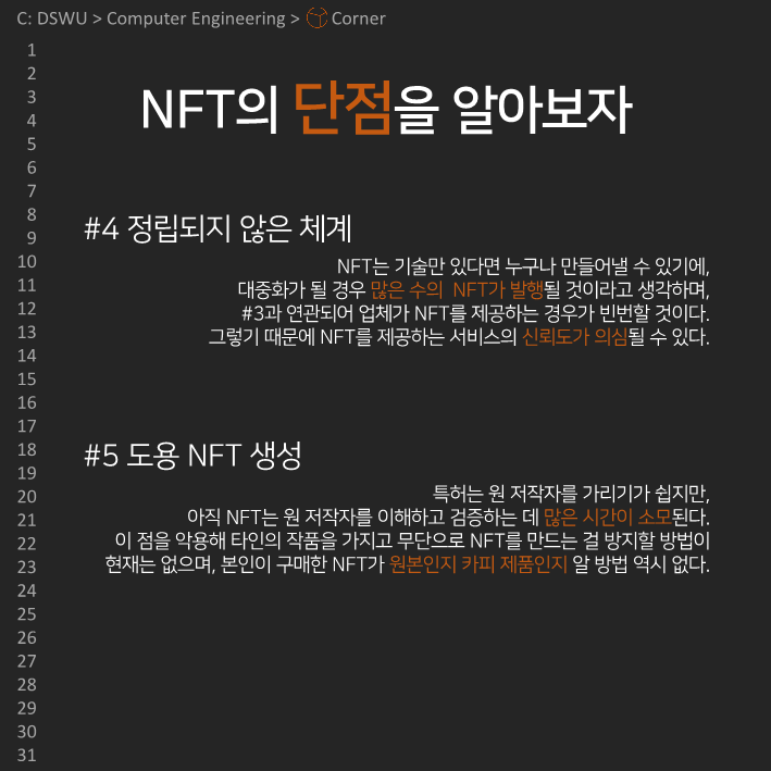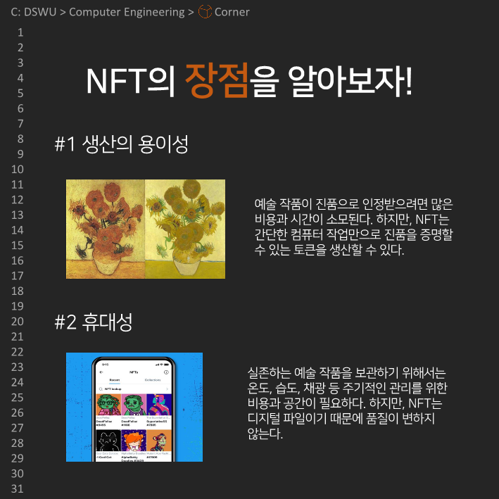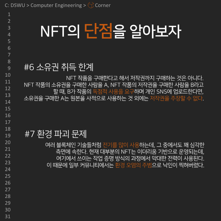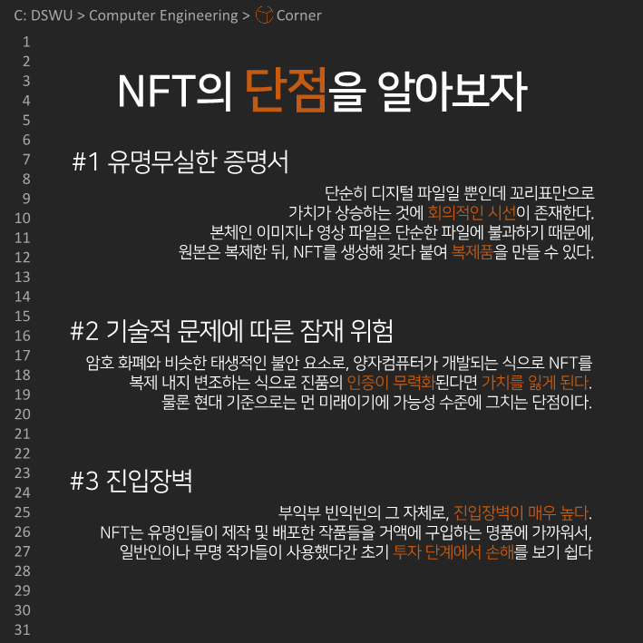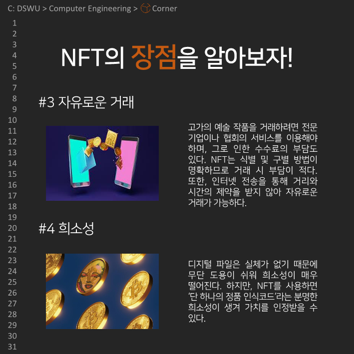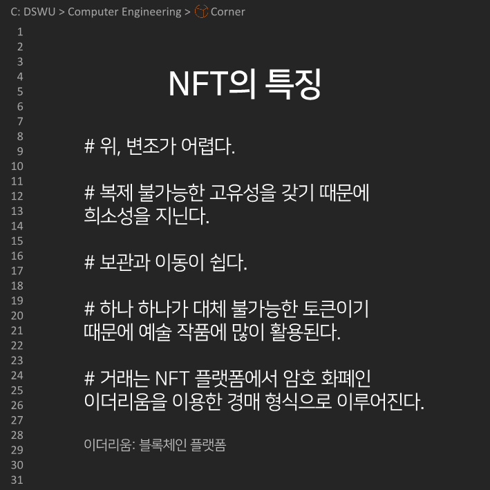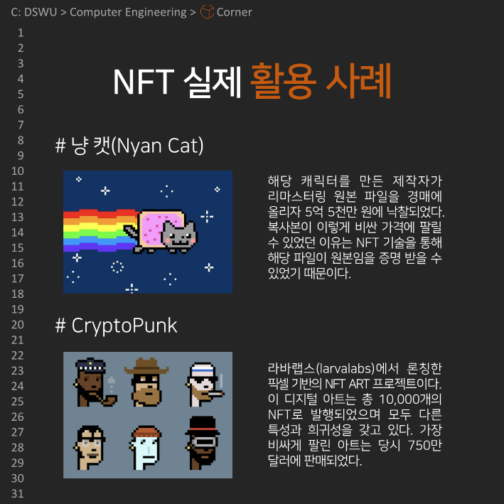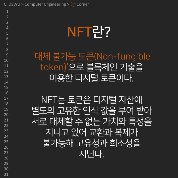 이전다음 0123456789 안녕하세요, 컴퓨터공학전공 개발 소모임 𝘾𝙤𝙧𝙣𝙚𝙧입니다. 코너의 아홉 번째 정기 콘텐츠를 공개합니다! 이번 정기 콘텐츠는 Team Undefined의 NFT에 대한 이야기인데요, NFT의 장단점과 활용사례에 대해 알아봅시다!